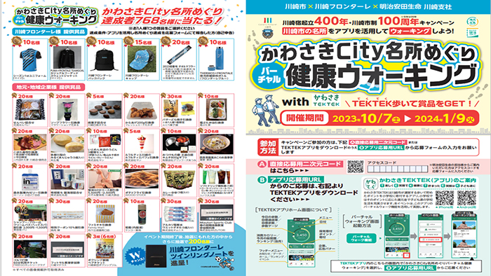 開催期間中にスマートフォンアプリ「かわさきTEKTEK」を活用してウォーキングを実施、総歩行距離「74㎞」達成を自己申告した方に、イベント終了後フロンターレのグッズをはじめとした地元・地域企業の皆様から提供された豪華賞品が抽選で当たります!