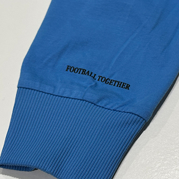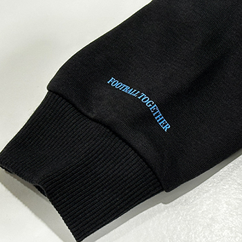 背中には今シーズンのユニフォーム柄をイメージしたプリントをデザインし、前面にはフロンターレブルーのプーマキャットロゴでシンプルに仕上げました。左袖の袖口にはクラブスローガンである「FOOTBALL TOGETHER」を入れた、PUMAとのコラボグッズです。裾口がすぼまっているのでストリートチックな着用がオススメです!!