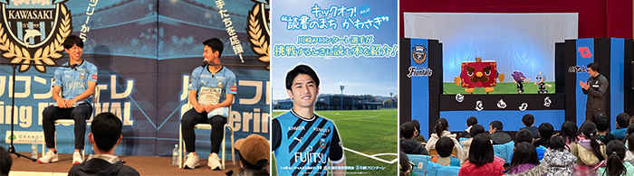 選手が選んだ図書を載せたリーフレット・しおり・ポスターの掲示・配布や、川崎フロンターレの選手による絵本読み聞かせ、ふろん太・ワルンタ・フーランの人形劇とスクールコーチによる読み聞かせ会の実施、など幅広い年齢層へ向けて読書の楽しさ・素晴らしさをPRし、青少年の健全育成や川崎市の豊かで明るいまちづくりに寄与していきます。