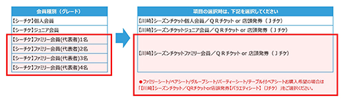 | 備考 | ・ファミリー会員の方は、代表者の会員番号でご購入ください。 ・複数単位で販売するファミリーシート、グループシート、パーティーシート、ペアシート、テーブル付きペアシートに関しては、上記「購入可能枚数」とは別にご購入いただけます。 |