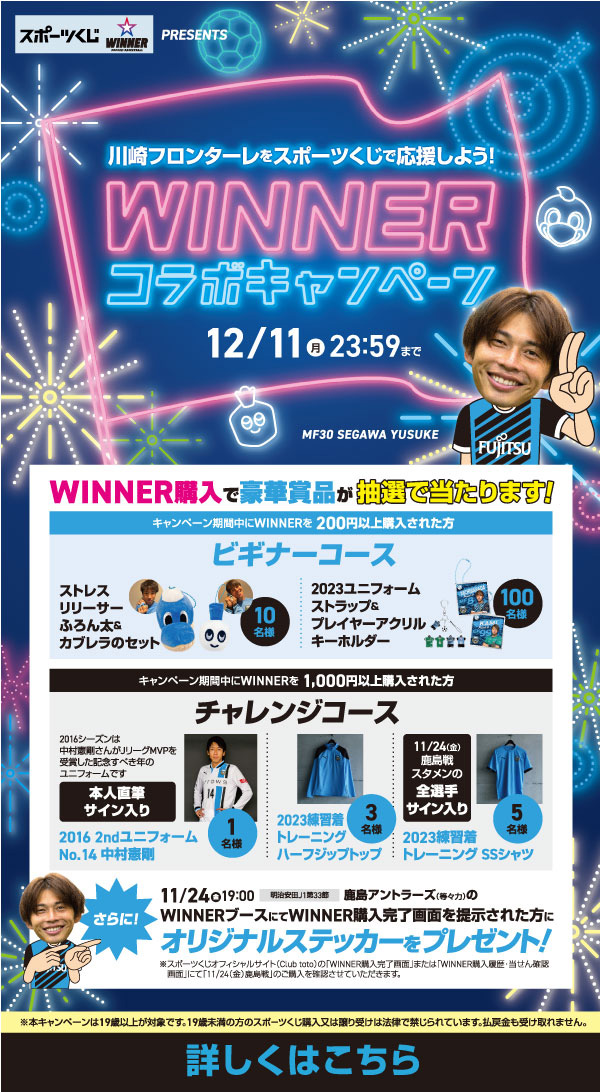 11月24日鹿島戦(等々力)のWINNERブースにてWINNER購入完了画面をご提示いただくと、川崎フロンターレオリジナルステッカーをプレゼント! ステッカーデザインは、当日のお楽しみ!!