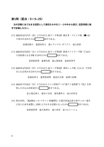 | 内容 | ・2023シーズンのフロンターレに関する100点満点の問題に解答。 ・参加賞に加え、成績優秀者(80点以上)には別途景品をプレゼント! |