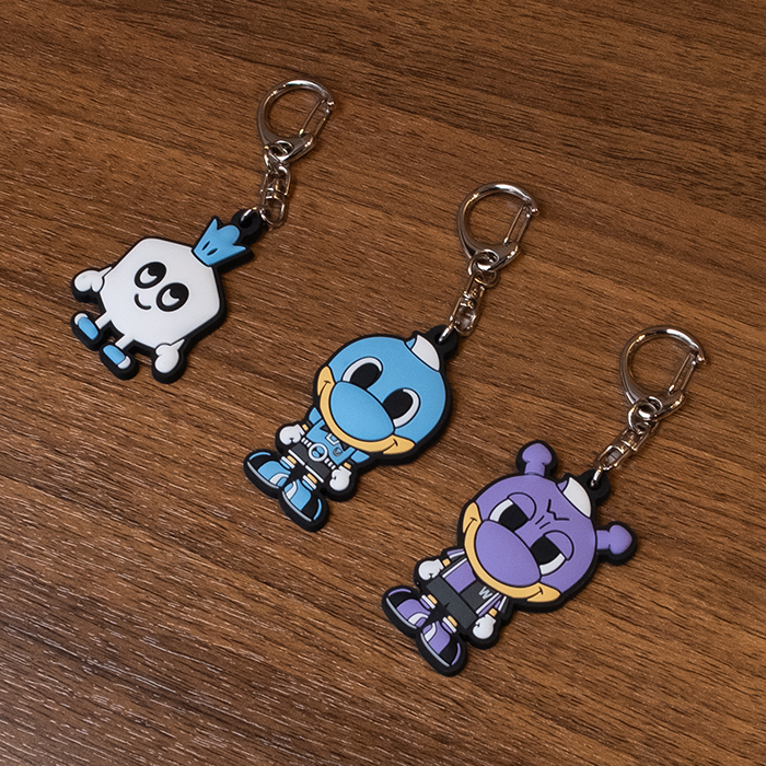 マスコットたちの顔や体がプクっと半立体的になっているラバーキーホルダーです! なぜかずっと触っていたくなるような、クセになる触り心地です。