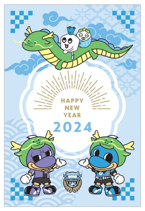 2024年の干支は“辰”ということで、マスコットたちが竜の被り物をかぶっていたり、竜に乗っているデザインに仕上げました。新年のご挨拶には川崎フロンターレデザインの年賀状を送りましょう!