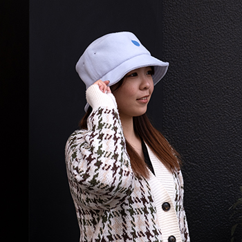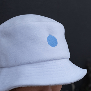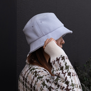 柔らかい触り心地の良い生地感のバケットハットは生地に淡い水色を採用し、ふろん太のシルエットを同系色で刺繍加工しています。冬の時期に活躍するグッズです!