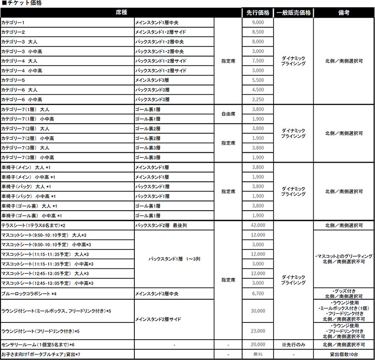 | 備考 | ◇ご利用にあたってはJリーグIDの会員登録(無料)が必要です ◇先行抽選販売で完売した席種は一般販売での販売はございません ◇カテゴリー7の1層(ゴール裏・自由席)以外は全席指定、個席選択が可能です ◇「センサリールーム」は先行抽選販売のみの取り扱いにつき、一般発売はございません ◇「マスコットシート」、「ブルーロックコラボシート」、「ラウンジ付シート」は紙発券のみの扱いとなります。(特典の引換え券が同時に発券されます) ◇お支払いはd払い、楽天ペイ、クレジットカードがご利用可能です ◇紙チケットの発券には、110円/枚の発券手数料と110円/枚のシステム利用料がチケット代金以外にかかります(QRチケットは、発券手数料・システム利用料がかかりません) ◇お一人様6枚までとなります ◇ダイナミックプライシング(変動価格)となり、販売状況により先行価格(固定価格)から上下いたします ◇バックスタンド側でマスコットイベントを実施予定です。詳細は後日発表します ◇カテゴリー7(ゴール裏)は対戦クラブの「応援」および「応援グッズの着用・使用」はできません |