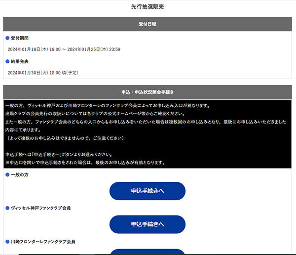先行抽選販売では「川崎フロンターレファンクラブ会員抽選」、「ヴィッセル神戸ファンクラブ会員抽選」、「一般抽選」の3つの申込入口がございます