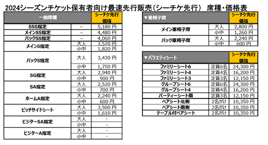 | 席種・価格 | 2024シーズンチケット保有者向け最速先行販売(シーチケ先行)特別販売価格(固定価格)