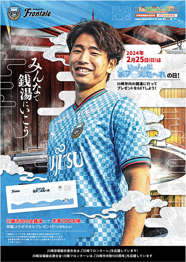 川崎フロンターレが地域貢献活動の一環として2010年にスタートした川崎市内銭湯の利用促進キャンペーン「いっしょにおフロんた~れ」。今年は2月25日(日)が「お風呂の日」=「おフロんた~れの日」です。