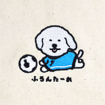 同じフロンターレサポーターの愛犬との散歩にはフロンターレデザインのトートバッグと共に! フロンターレカラーのウェアを着たワンちゃんを刺繍加工でデザインしました。サッカーボールをよく見るとカブレラが!? ペットボトルやビニール袋などの散歩セットとしてはもちろん、ランチトートとしてもオススメです。