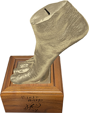 記録にも記憶にも残り続ける数多くのバス、シュートを決めてきた中村憲剛の右足を型取りし、1/1サイズのプロンズで仕上げました。オプジェとしてだけでなく実用品としての二刀流を実現すべく、貯金箱機能を施しました。「止める・蹴る」を体現してきた足から、「お金・貯める」を体現する足へ。