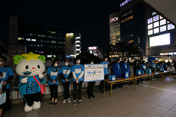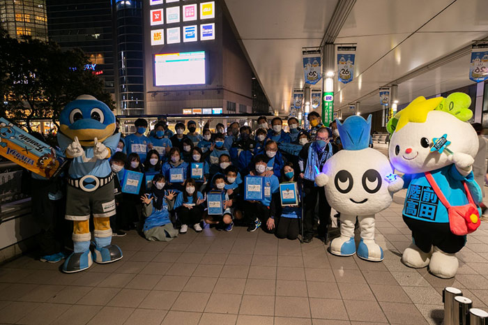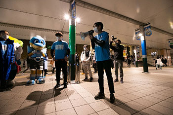 | ②3月11日(月) 時間:18:00~19:00 場所:JR南武線「武蔵溝ノ口」駅・東急田園都市線「溝の口」駅 ペデストリアンデッキ 参加者:クラブスタッフ、川崎フロンターレU-12選手、ふろん太、カブレラ、たかたのゆめちゃん、中西哲生クラブ特命大使、中村憲剛FRO |