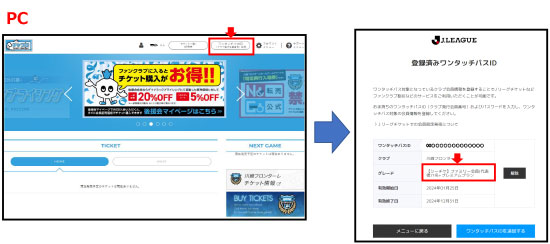 ※ご自身の会員種別(グレード)はチケフロ(Jリーグチケット)にログインいただき「ワンタッチパスID設定」のページで確認できます。(JリーグIDとワンタッチパスIDの紐づけ後) |