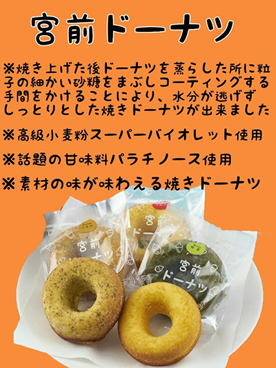 | 商品 | ◇宮前ドーナツ ・プレーン:220円(税込) ・レモン:220円(税込) ・イチゴ:220円(税込) |
