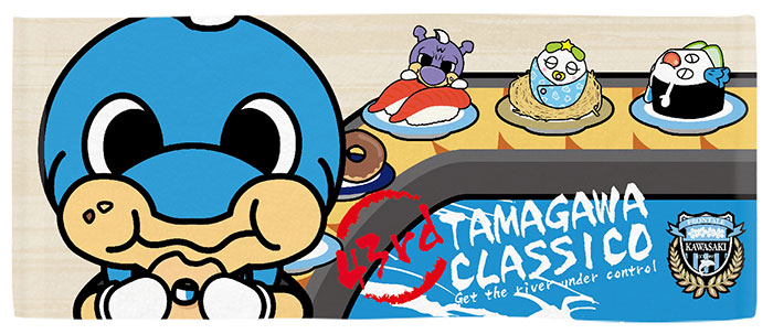 「美食クラシコ」と銘打った第43回の多摩川クラシコに合わせてデザインに!! ふろん太がもぐもぐするのは、FC東京新オリジナルグルメの「東京ドローナッツ」。軍艦巻きの上で食べ過ぎて眠るカブレラはいくら何でもやり過ぎですね...