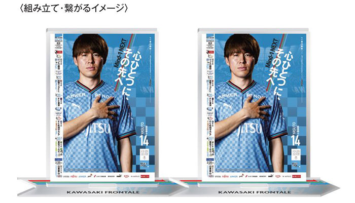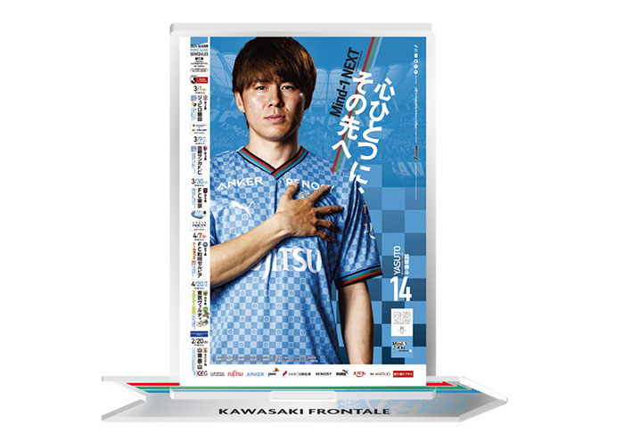 川崎市内の商店街やサポートショップの皆さんに掲示していただいている、ホームゲームの予定を伝える「スケジュールポスター」のデザインをアクリルスタンドに!! 集める楽しさも感じられるように、台座部分は“繋がる”仕様。