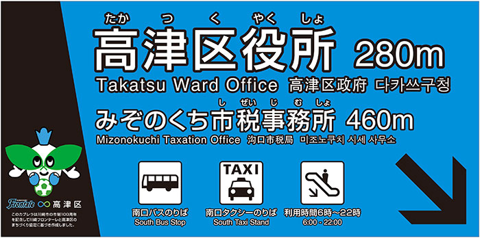 武蔵溝ノ口駅から高津区役所への行き方を分かりやすくするため、新たに南北自由通路に案内サインを設置します。