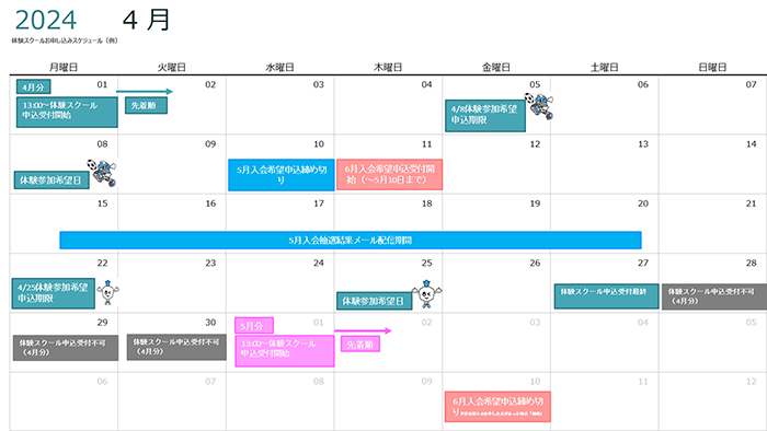 ・体験スクール対象クラスは「当月に」空きのあるクラスが対象となっているため、翌月以降の入会を確約するものではございません(体験ができても入会希望の申込状況次第では、抽選となる可能性がございます)