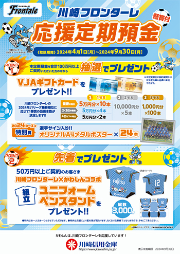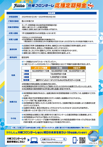 オフィシャルパートナー「川崎信用金庫」より、「川崎フロンターレ応援定期預金(懸賞付)」が発売されますので、お知らせいたします。