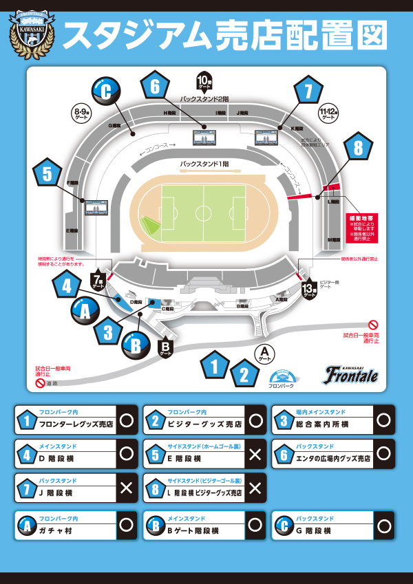 | 販売場所 | 場外フロンパーク(児童遊園)「グッズ売店」 場外フロンパーク(メインスタンド前広場)「ガチャ村」横 場内E階段横(ホームゴール裏) 場内G階段横(バックスタンド) 川崎フロンターレオフィシャルショップ「アズーロ・ネロ」 |