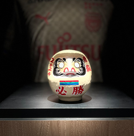 2024川崎カルチャーユニフォームデザインをイメージしたカラーリングの必勝だるまです。川崎区大師町にある、だるま店「小田切商店」にご協力いただきました。デスクなどに置いて、目を入れられるように祈願しましょう。