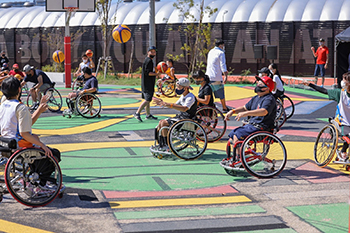 障がいの有無に関わらず誰もがスポーツを楽しめるフィールドとして特設コートを設置し、車いすバスケットボール、車いすラグビーの現役パラTOPアスリートの「北風大雅選手(車いすバスケットボール)」「若山英史選手(車いすラグビー)」による豪華な体験会を開催!