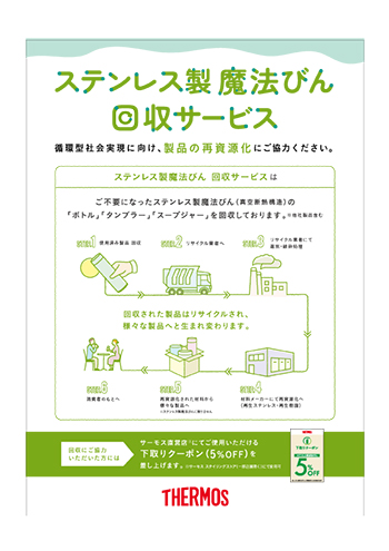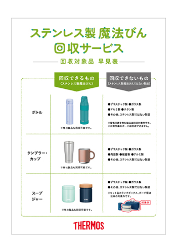 | その他・注意事項 | 回収対象はステンレス製魔法びんとなります。他社製品も回収可能です。 ◇回収対象外の製品 ・タンブラー/カップ:プラスチック製、ガラス製、陶器製、磁器製、アルミ製、その他ステンレスではない製品 ・スープジャー:プラスチック製・ガラス製・その他ステンレスではない製品 |