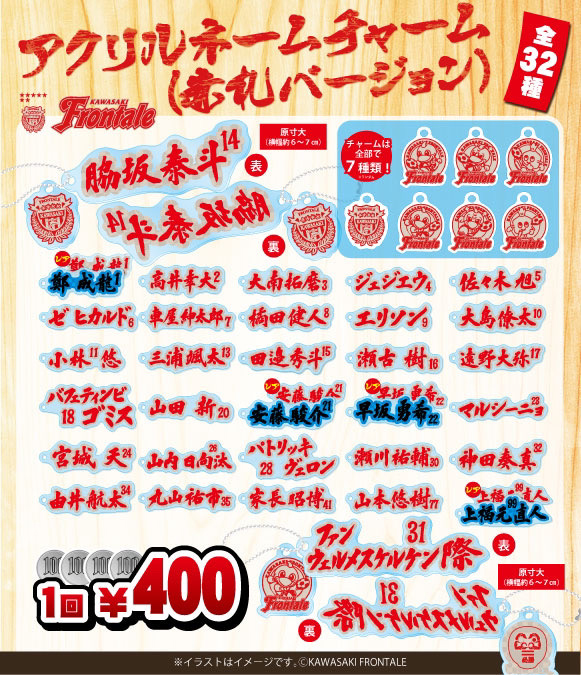 | 販売場所 | 場外フロンパーク(野球場前広場)「グッズ売店」 場内総合案内所横「グッズ売店」 場内バックスタンド「グッズ売店」 川崎フロンターレオフィシャルショップ「アズーロ・ネロ」 川崎フロンターレオフィシャルWEBショップ「AZZURRO NERO」 |