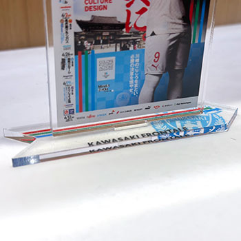 川崎市内の商店街やサポートショップの皆さんに掲出したいてだき、ホームゲームの予定を伝える「スケジュールポスター」デザインをアクリルスタンドに!! 集める楽しさも感じられるように、台座部分は“繋がる”仕様。