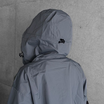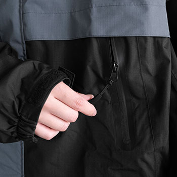 ダブルファスナー仕様なので気温に合わせて調整も簡単なレインウェアです。フード周り・袖口はぴったりフィットできるように調整でき、雨の侵入を防ぎます。