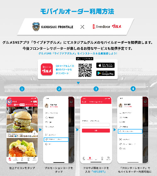 | 注意事項 | ・本事前決済サービスでは「ライブドアグルメ」アプリのインストールと利用登録が必要となります。アプリダウンロードはこちら ・競技場内でのお渡しとなるため、チケット(ホーム側)をお持ちの方のみご購入ください。 ・当日、FRO CAFEでのお受け取りはできませんのでご注意ください。 ・お客様都合でのキャンセルは受付できません。予めご了承ください。 ・商品お渡し時にマイバッグの準備にご協力ください。 ・お一人様あたりの購入数に制限はございませんが、複数ご購入される際は、都度ご購入ください。 ・2023年2月1日の決済システムアップデートにより、クレジットカード情報の事前登録が可能になりました。それに伴い、ご登録いただいていたクレジットカード情報がリセットされましたので、既にクレジットカードをご登録いただいていた方は、お手数ですが再登録いただきますようお願い申し上げます。 |