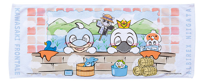 新潟にそびえる八海山を背景にアルビレックス新潟のマスコットであるアルビくんと混浴しているデザインです。カブレラはお湯の代わりにお酒を注いでいる...!?