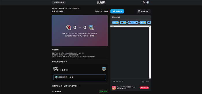 今シーズンもフロンターレアカデミーの選手たちの戦いぶりをタイムリーに皆さんにお届けするため、スポーツライブエンターテイメントアプリ「Player!」にて試合速報を実施します。
