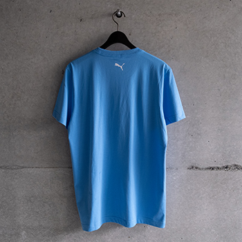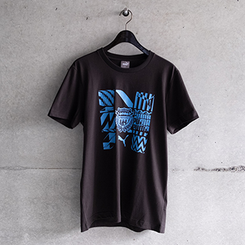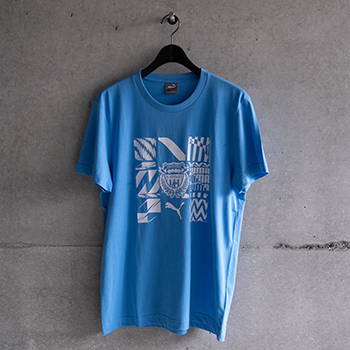 幾何学模様の中にクラブエンブレムとプーマロゴがデザインされたTシャツです。フロンターレブルーとブラックの2色をご用意しました!!
