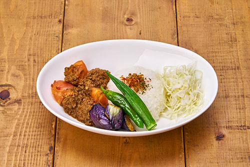 スパイスを効かせた自家製キーマカレーに素揚げした野菜をトッピング