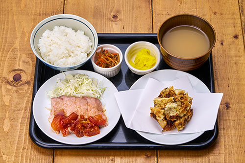 しらすと茄子のかき揚げとフレッシュトマトを使ったトンテキの満腹定食。
