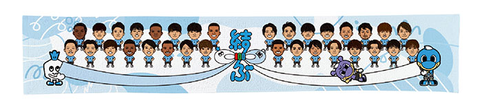 2024ファン感謝デーのテーマの「結ぶ」ロゴと選手とマスコットがデザインされたタオルマフラーです。