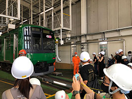 ピット線に止まっている電車を見学し、車輪の大きさなどを体感してください。