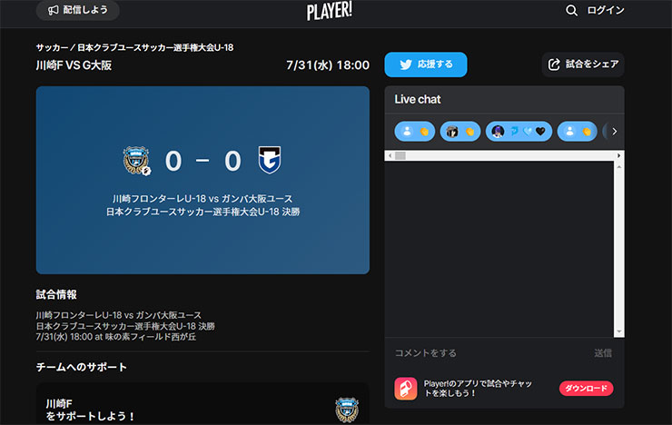 今シーズンもフロンターレアカデミーの選手たちの戦いぶりをタイムリーに皆さんにお届けするため、スポーツライブエンターテイメントアプリ「Player!」にて試合速報を実施します。
