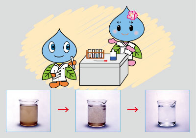 みずみず博士たちと一緒に浄水場で行われている「水をきれいにするしくみ」を体験してみよう。