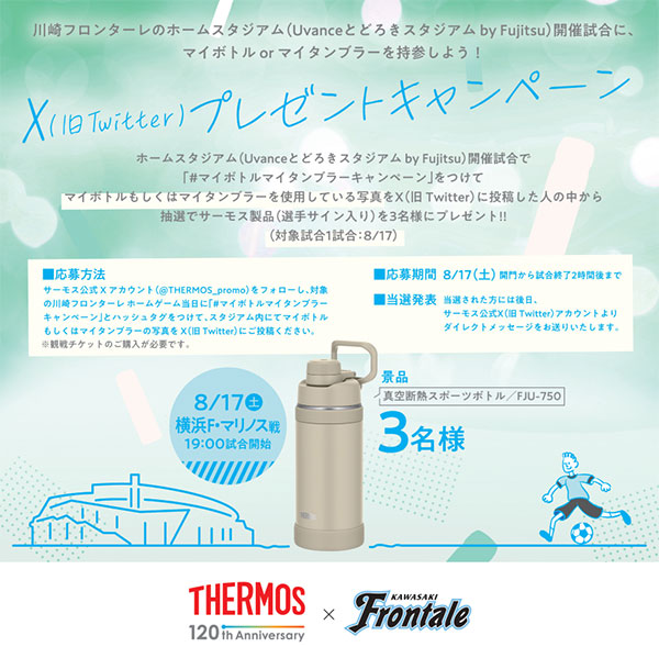川崎フロンターレホームゲームで、サーモスの製品が当たるプレゼントキャンペーンをX(旧Twitter)にて実施します。