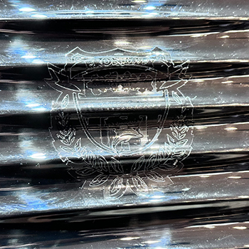 選手の移動で使用しているラゲッジケースをシックなブラックエンブレムをデザイン。表面の曲線美に沿って職人が一つ一つ手作業で貼り付け、美しく仕上げました。