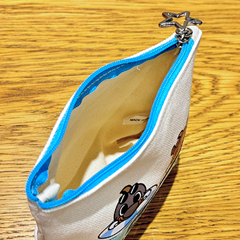 簡単に収納物が確認でき、斜めに大きく開くファスナーで取り出しも簡単なポーチ。小銭などを入れてバッグの持ち手にカラビナでカチャっと付けるのがおすすめです!!