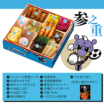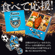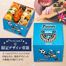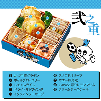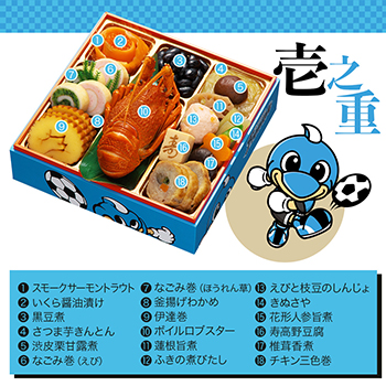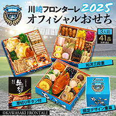 川崎フロンターレ オフィシャルおせちです。お正月に家族みんなで楽しめる人気の和洋折衷の食材(牛タン、ボイルロブスター、スモークサーモントラウト、いくら醤油漬け、かに甲羅グラタン、ハンバーグ照焼ソース等)を彩り豊かに盛り、お重のサイズもアップ(6寸→6.5寸)。