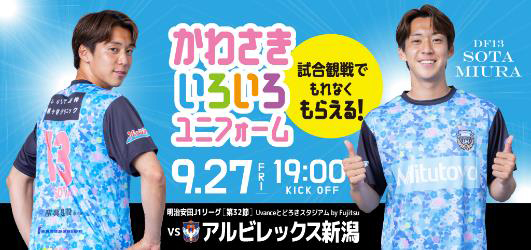 ※詳細は『9/27 新潟「チケット販売(かわさき いろいろ ユニフォーム付きチケット)」のお知らせ』をご確認ください。