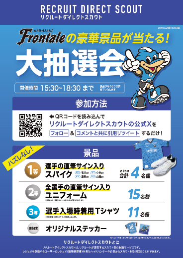 | 参加方法 | ・リクルートダイレクトスカウトの公式Xを「フォロー」&「選手の好きなプレーを入れて該当画面をリポスト」するだけ! ・引用リポスト完了画面をお持ちの上、ブースまでお越しください。 |