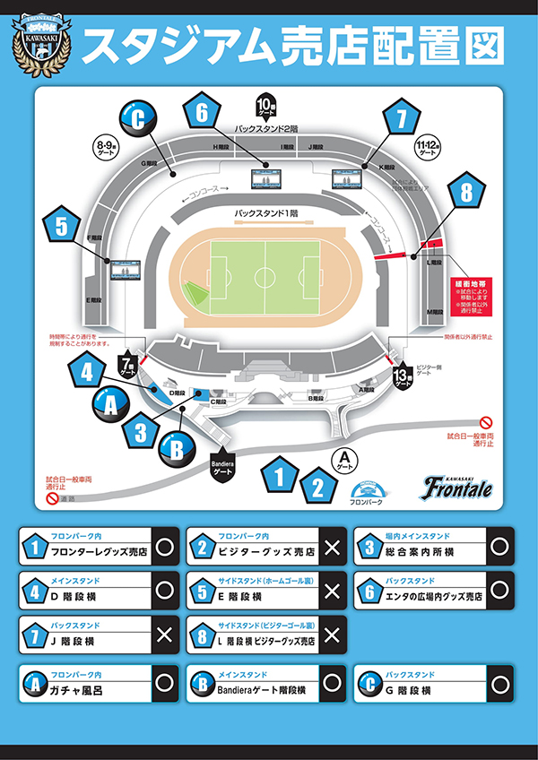 TEL 044-767-6111(営業時間 11:30~21:00/月曜定休 ※月曜日が祝日の場合は翌火曜日がお休みとなります。またホームゲーム等開催日は変更の可能性あり)