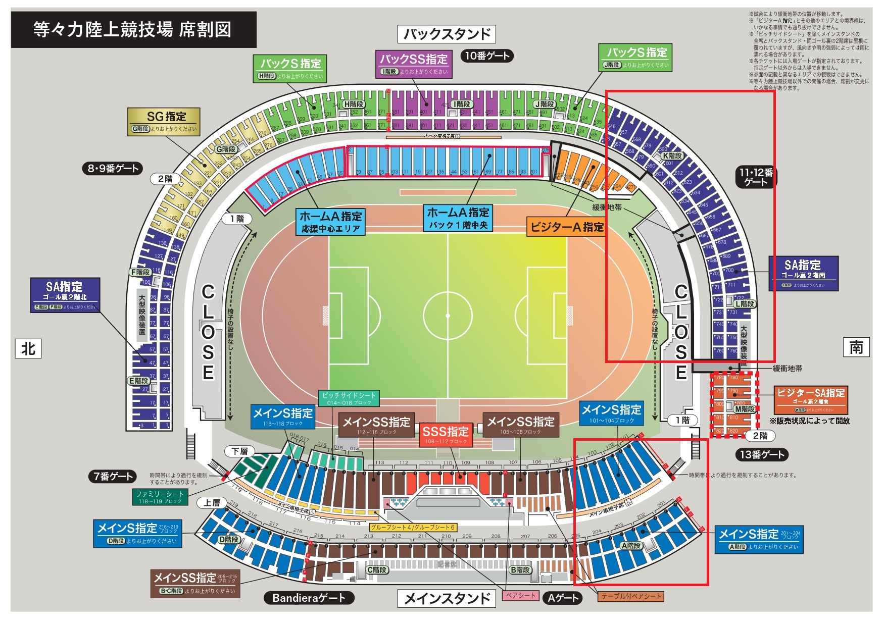 上記席割図の赤枠エリアが対象席種となります。席の指定はできませんので、ご了承ください。