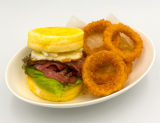 全粒粉のパンとパストラミビーフの相性が良く、 少量のからしマヨネーズで全体のバランスを引き締めてみました! サクサクのオニオンリングと一緒にお試しください。