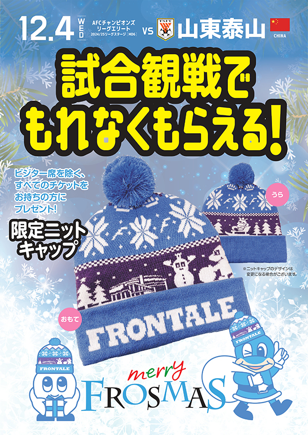 山東泰山戦、冬の寒さ対策にも最適な「ニットキャップ クリスマスver.」を、ビジター席を除くすべての来場者の皆様にプレゼントいたします! この特別なアイテムで、温かさとクリスマス気分を一緒に楽しみましょう!